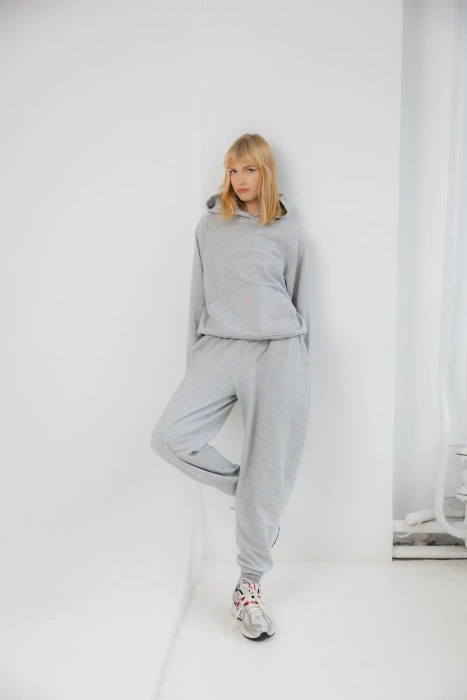 Wyjątkowy dres w odcieniu szarym, to ponadczasowy klasyk, którego nie może zabraknąć w naszejgarderobie! Wykonany z wysokiej jakości bawełny. Materiał jest pętelkowy i miękki, niezwykle przyjemny w dotyku, dzięki czemu zapewni Ci komfort i ciepło w chłodniejsze dni. Bluza typu kangurka z praktycznym kapturem doskonale sprawdzi się na co dzień, a spodnie ze ściągaczami u dołu zapewniają idealne dopasowanie i nowoczesny wygląd. Całość tworzy stylowy zestaw, który łączy wygodę i ponadczasowy design.