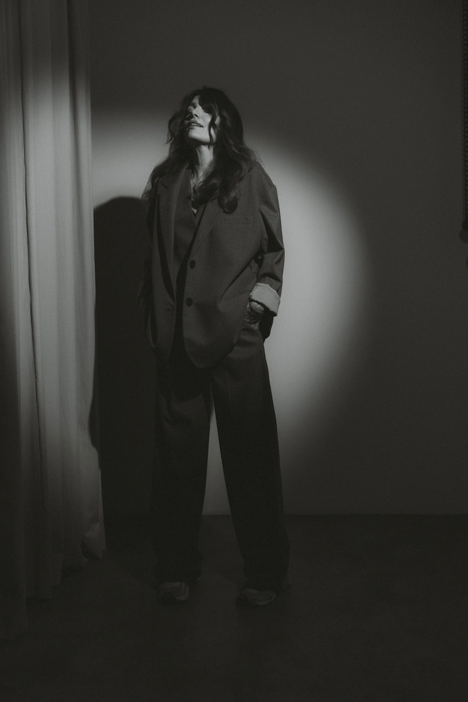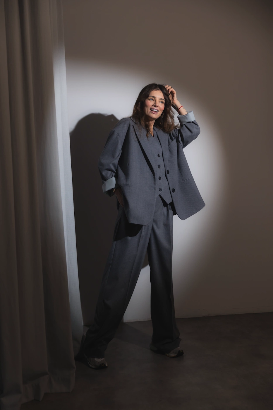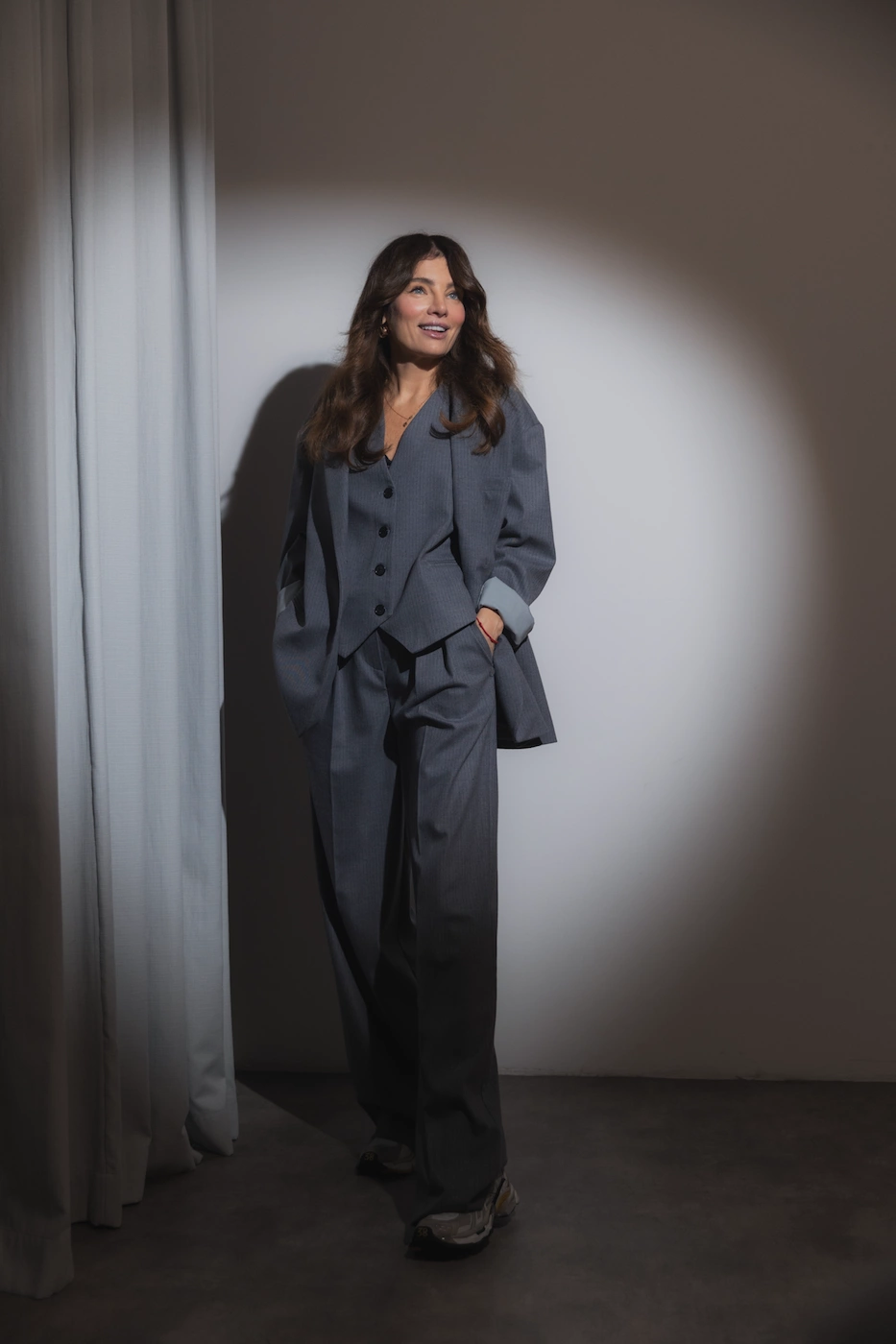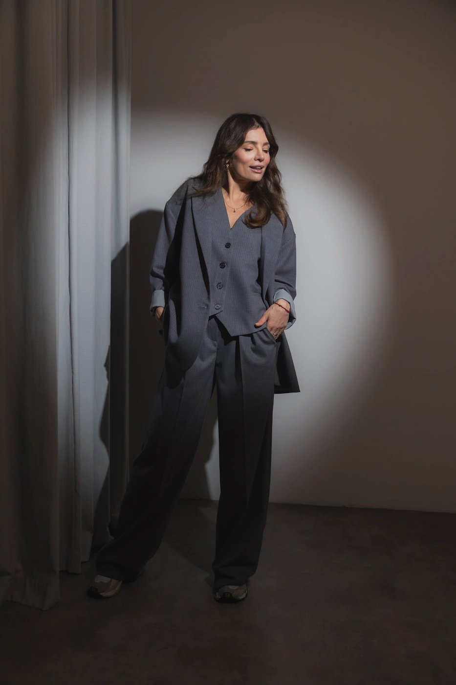 Modelka ma 173 wzrostu i marynarkę w roz. M/L Bawełniana długa marynarka typu oversize na podszewce, posiada kieszenie, zapinana na dwa guziki, w szarym kolorze w delikatny grafitowy prążek.