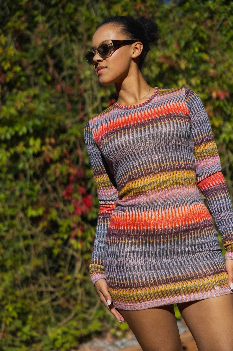 Sukienka prążkowana w kolorowy wzór ombre. Wykonana z elastycznej dzianiny, podkreśla sylwetkę i zapewnia wygodę noszenia. Intensywne barwy w odcieniach pomarańczu, różu, fioletu i musztardowej żółci tworzą efekt ombre.