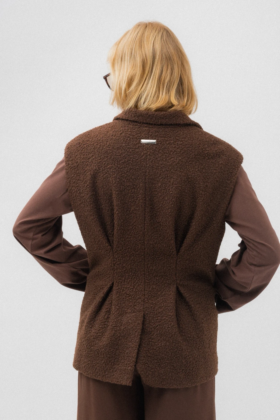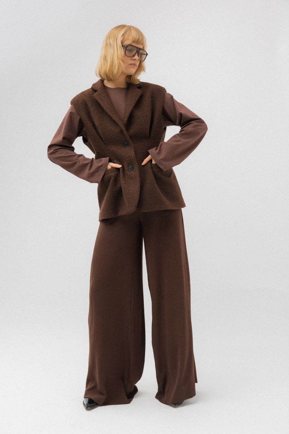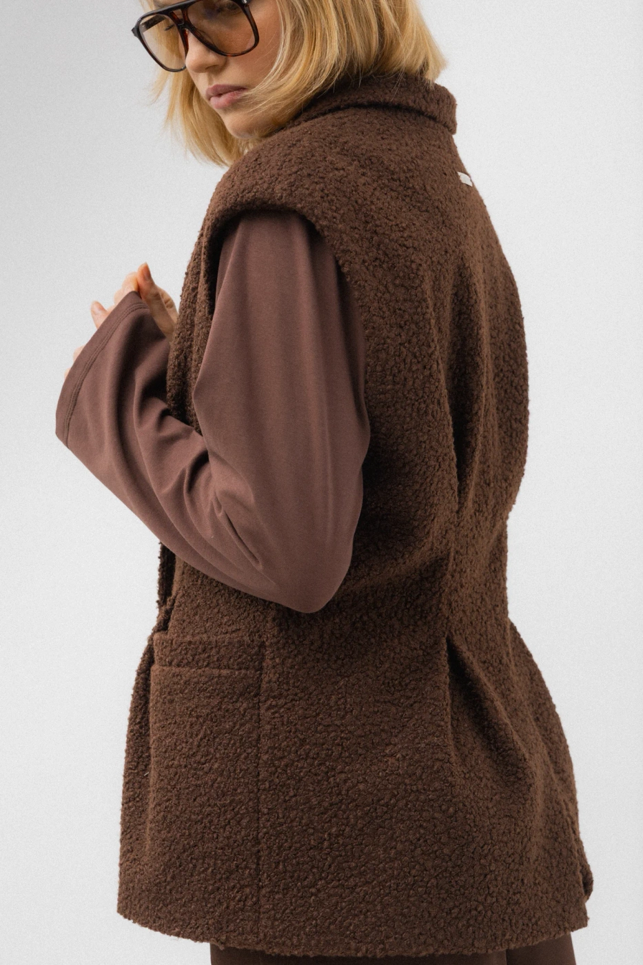 Kamizelka berwer to elegancka i funkcjonalna propozycja na chłodne dni. Wykonana z miękkiej bucli w czekoladowym odcieniu, doskonale wpisuje się w zimowe i wiosenne trendy, dodając stylizacji subtelnej elegancji. Jej oversize'owy krój zapewnia pełną swobodę ruchów, co sprawia, że jest idealnym wyborem zarówno na co dzień, jak i na bardziej casualowe wyjścia. Posiada kieszenie więc cala kamizelka zachwyca prostotą formy i funkcjonalnością, świetnie komponując się z różnorodnymi stylizacjami.