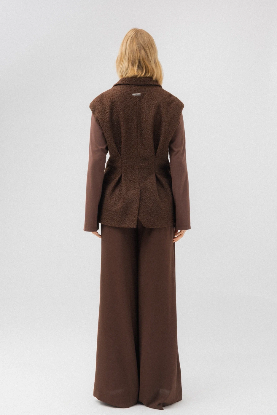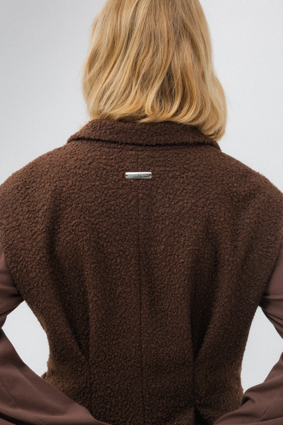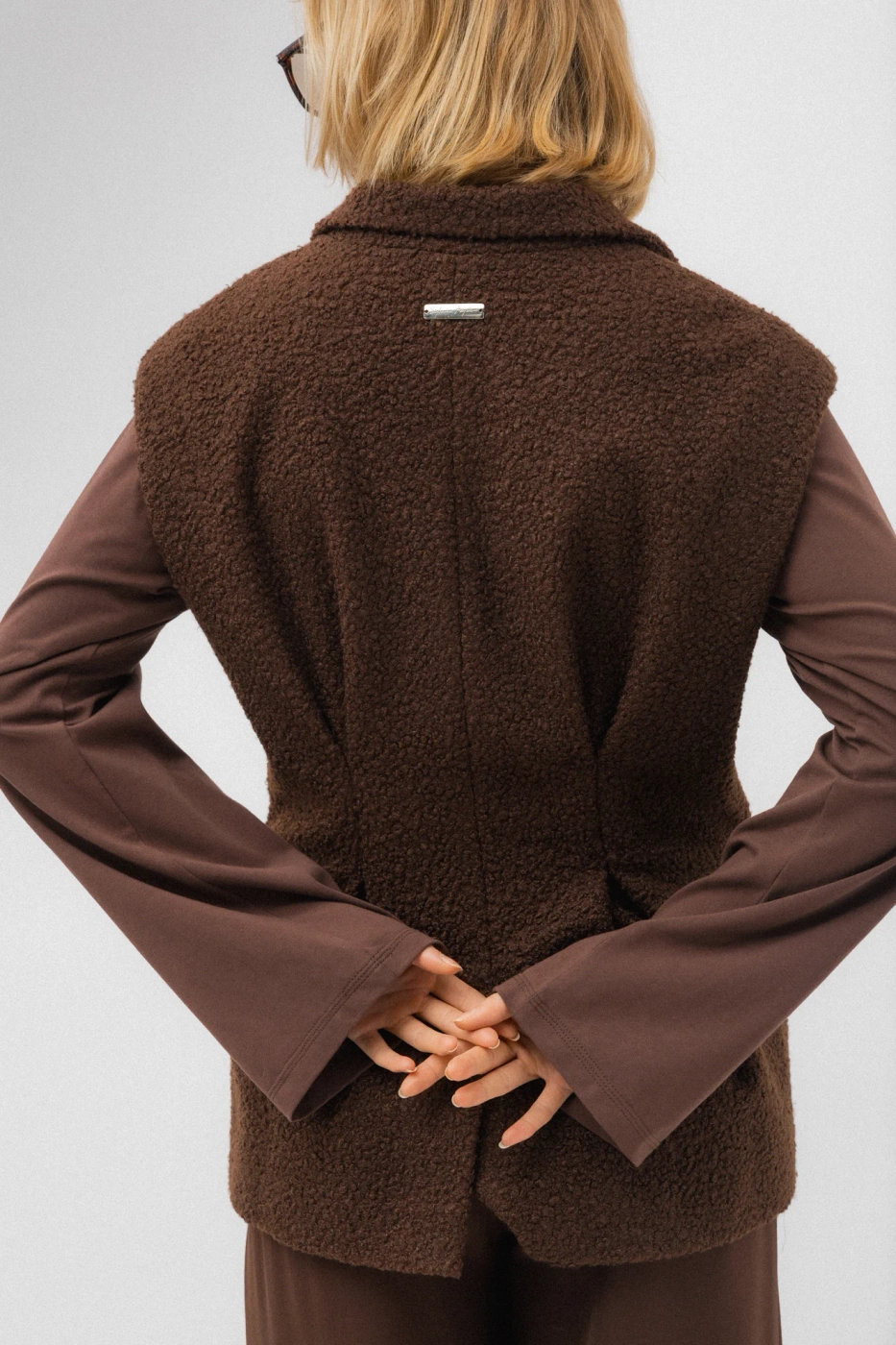 Kamizelka berwer to elegancka i funkcjonalna propozycja na chłodne dni. Wykonana z miękkiej bucli w czekoladowym odcieniu, doskonale wpisuje się w zimowe i wiosenne trendy, dodając stylizacji subtelnej elegancji. Jej oversize'owy krój zapewnia pełną swobodę ruchów, co sprawia, że jest idealnym wyborem zarówno na co dzień, jak i na bardziej casualowe wyjścia. Posiada kieszenie więc cala kamizelka zachwyca prostotą formy i funkcjonalnością, świetnie komponując się z różnorodnymi stylizacjami.