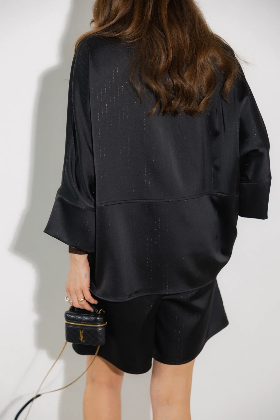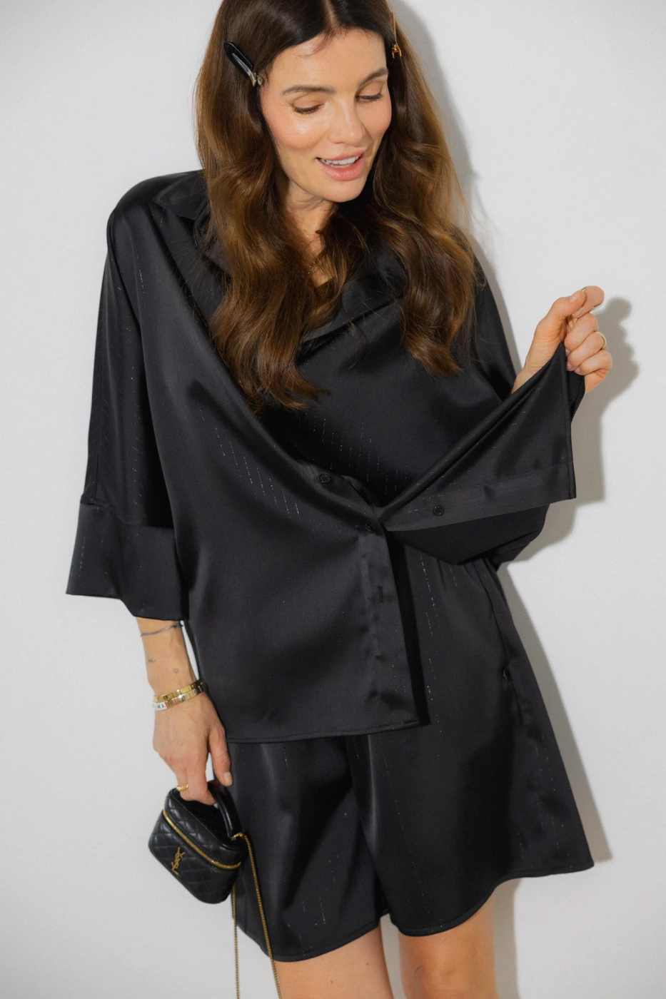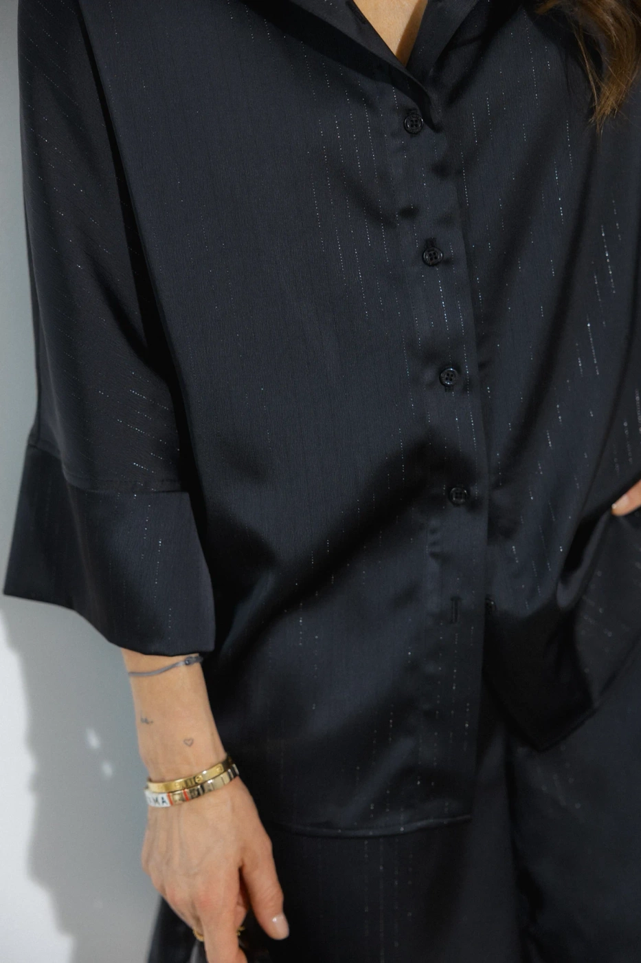 Luźna koszula o lekko oversize’owym kroju, uszyta z gładkiej tkaniny przypominającej satynę. Zapinana na guziki, z szerokimi rękawami – sprawdzi się zarówno w codziennych, jak i bardziej wyjściowych stylizacjach. Najlepiej wygląda w komplecie ze spodenkami z tego samego materiału – razem tworzą nowoczesny, wygodny zestaw do noszenia na co dzień.