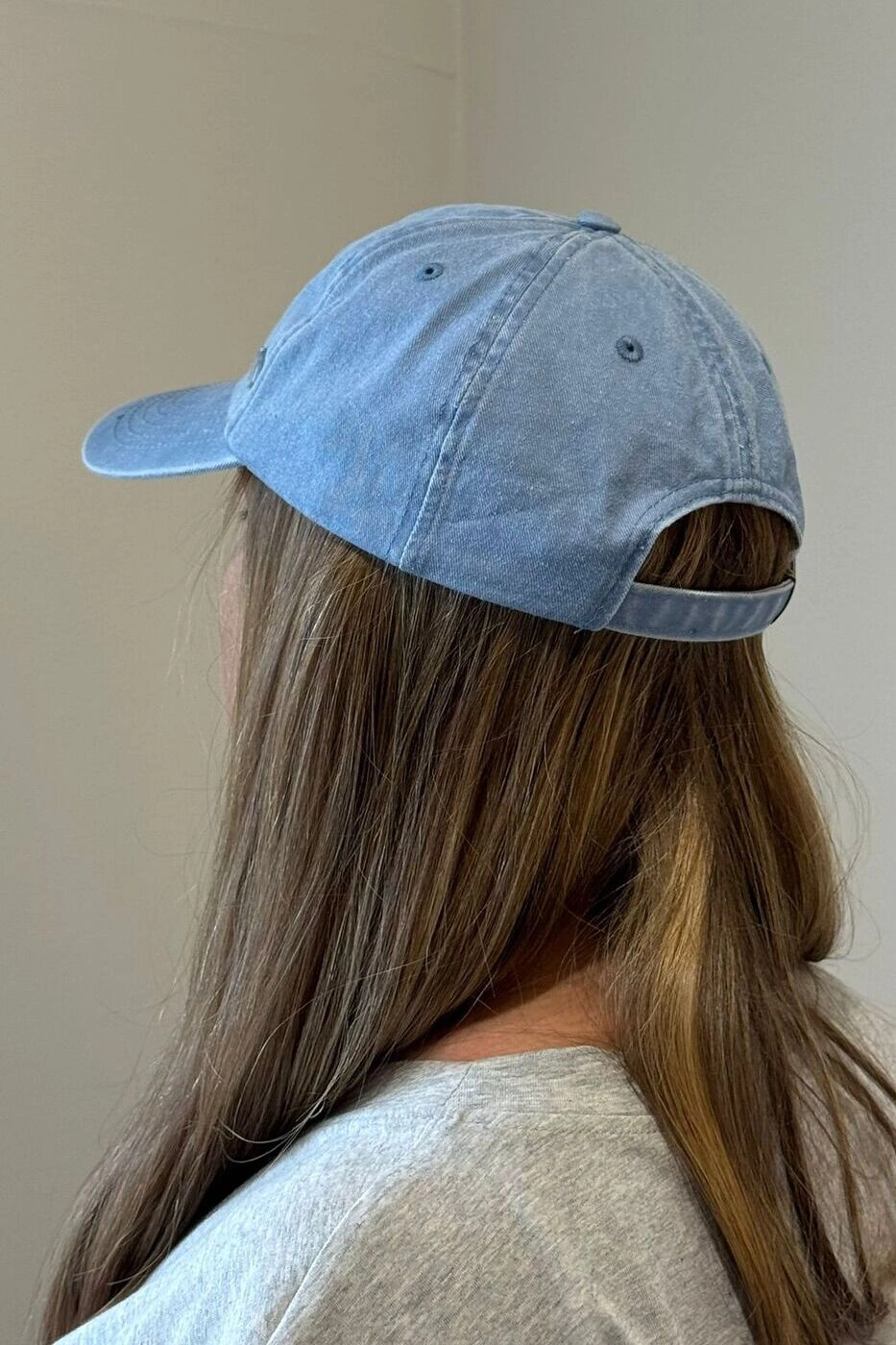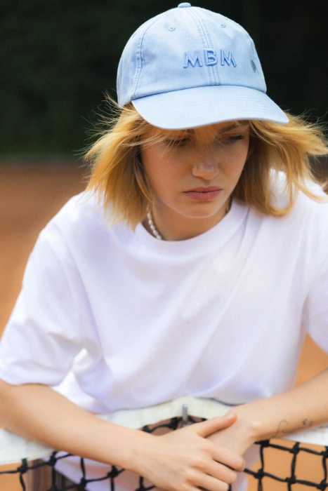 Klasyczna czapka bejsbolowa w kolorze baby blue, wykonana z bawełny. Model ozdobiony wypukłym haftem z inicjałami „MBM” na przodzie oraz niewielką, logowaną przypinką po boku. Delikatnie postarzany daszek z przetarciami nadaje jej swobodny, streetwearowy charakter. Regulowane metalowe zapięcie z tyłu pozwala na dopasowanie do różnych rozmiarów głowy.