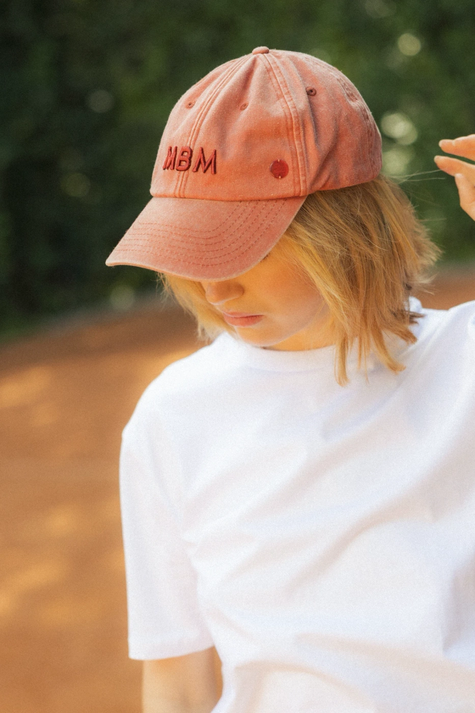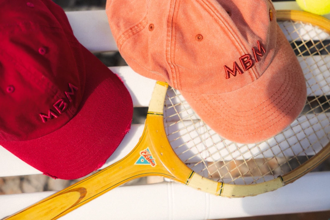 Klasyczna czapka bejsbolowa w kolorze red vintage, wykonana z bawełny. Model ozdobiony jest wypukłym haftem z inicjałami „MBM” na przodzie oraz niewielką, logowaną przypinką po boku. Delikatnie postarzany daszek z przetarciami nadaje jej swobodny, streetwearowy charakter. Regulowane metalowe zapięcie z tyłu pozwala na dopasowanie do różnych rozmiarów głowy.
