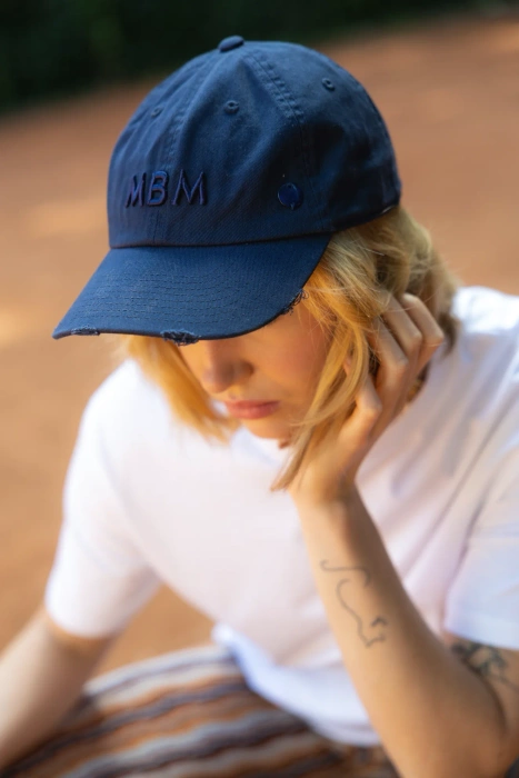 Klasyczna czapka bejsbolowa w kolorze dark blue, wykonana z bawełny. Model ozdobiony wypukłym haftem z inicjałami „MBM” na przodzie oraz niewielką, logowaną przypinką po boku. Delikatnie postarzany daszek z przetarciami nadaje jej swobodny, streetwearowy charakter. Regulowane metalowe zapięcie z tyłu pozwala na dopasowanie do różnych rozmiarów głowy.