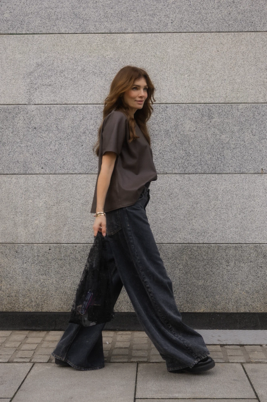 Styl, elegancja i nowoczesny design w jednym! Ta wyjątkowa koszulka na krótki rękaw o kroju w kształcie dzwonka to propozycja dla kobiet, które lubią wyróżniać się z tłumu. Wykonana z wysokiej jakości eko-skóry, doskonale dopasowuje się do sylwetki, podkreślając jej atuty, a jednocześnie gwarantując komfort noszenia. Z tyłu znajduje się charakterystyczny trójkątny element z emblematem logo, który nadaje całości designerskiego, luksusowego charakteru. Brązowy odcień świetnie komponuje się z klasycznymi i nowoczesnymi stylizacjami – zarówno na co dzień, jak i na wieczorne wyjścia.