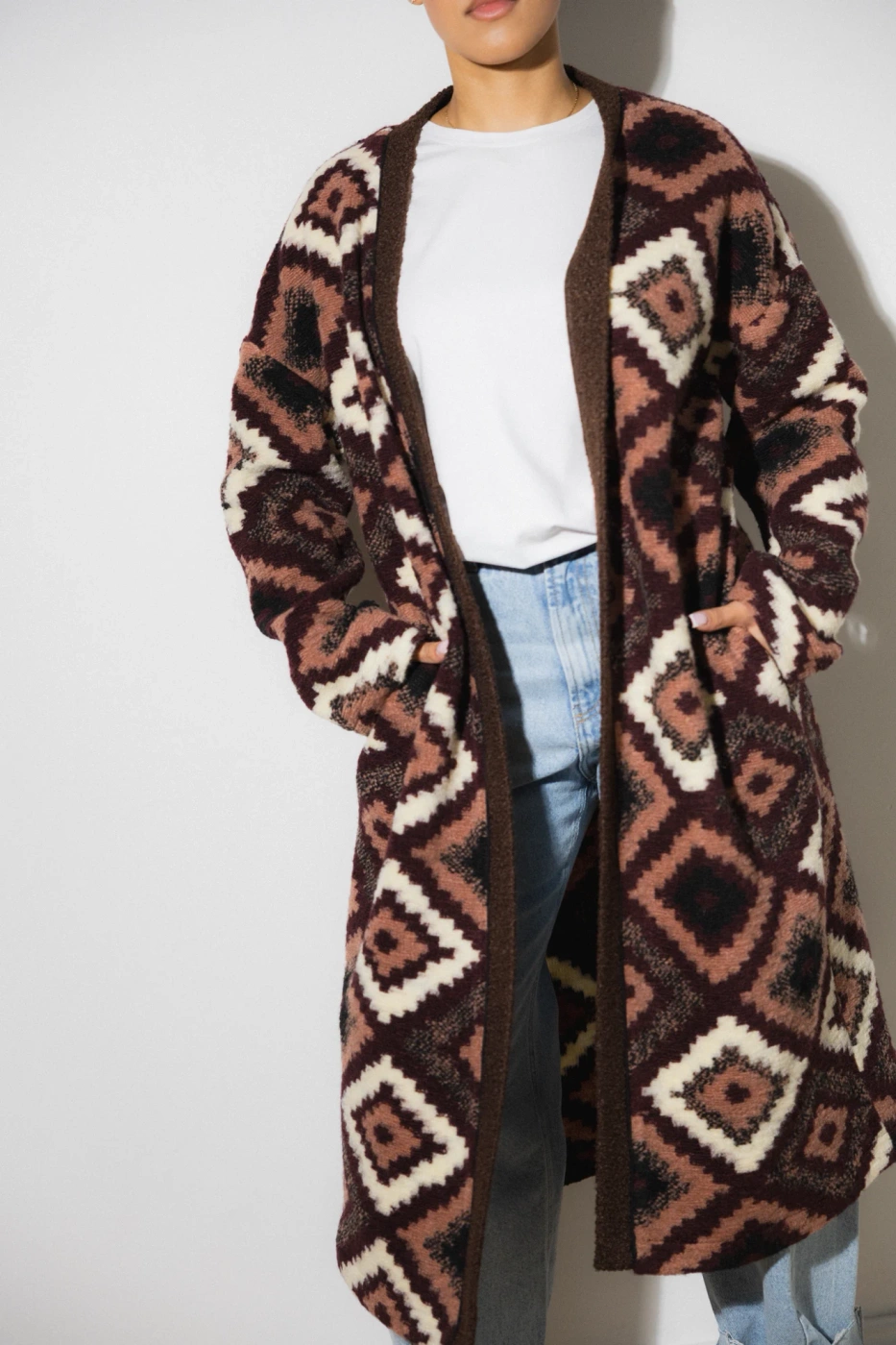 Lapponie Cardigan to wyrazisty, długi kardigan inspirowany energią magicznego miejsca i krainy reniferów, które istnieje naprawdę! Przyciąga uwagę odważnym, geometrycznym wzorem w intensywnych barwach, które nadają mu niepowtarzalny charakter. Swobodny, otwarty krój sprawia, że doskonale komponuje się z warstwowymi stylizacjami, a miękka dzianina podkreśla jakość. Z tyłu wszyta gumka, dla podkreślenia sylwetki.