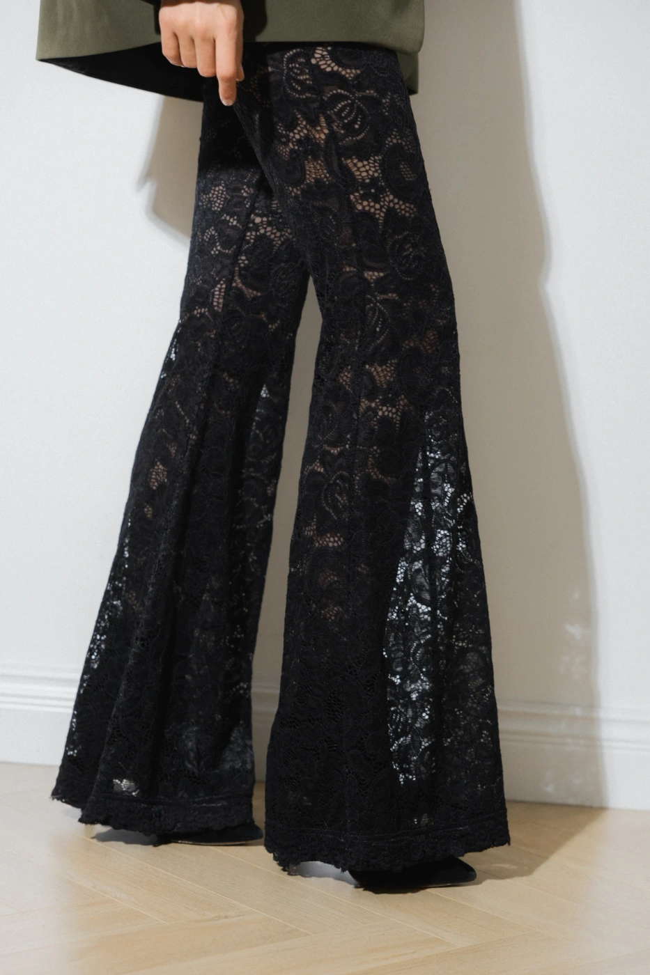 Czarne spodnie z delikatnej koronki to połączenie zmysłowości i nowoczesnego stylu. Dopasowana góra subtelnie podkreśla sylwetkę, a rozszerzane nogawki nadają całości lekkości i wyrafinowanego charakteru. Przezroczysta koronka o kwiatowym wzorze tworzy efektowny, przyciągający uwagę look, idealny na wieczorne wyjścia, imprezy lub stylowe sesje zdjęciowe. Świetnie łączą się zarówno z oversize’ową marynarką, jak i eleganckimi szpilkami, tworząc wyrazisty, modny zestaw.