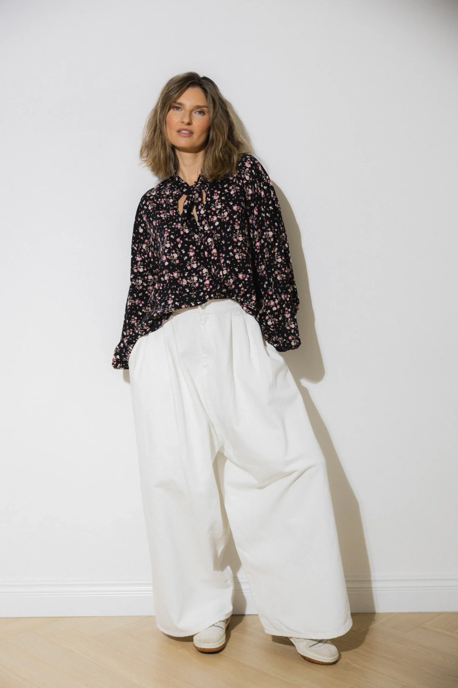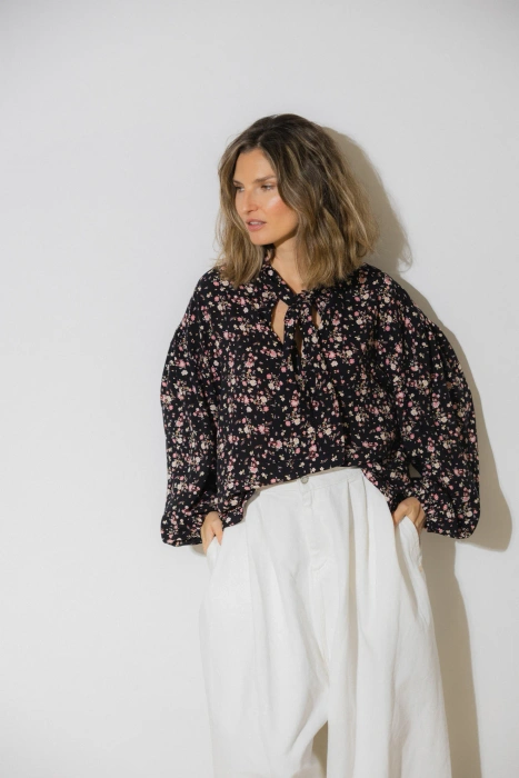 CZARNA BLUZKA Z WIĄZANIEM W KWIATY
