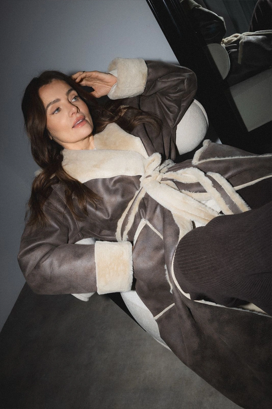 Oto nowa odsłona - długi kożuch w fasonie oversize, który łączy w sobie nonszalancję i elegancję! Wyposażony w dodatkowy wiązany pasek w tym samym materiale.  Wykonany z sztucznego futra w ciepłych kremowo-brązowych odcieniach, ten ponadczasowy model z pewnością przyciągnie spojrzenia. Gładkie wykończenie nadaje mu minimalistycznego uroku, a zapinanie na napy to funkcjonalny detal, który podkreśla jego nowoczesny charakter. Ten kożuch to nie tylko element garderoby – to manifest stylu dla kobiet, które nie boją się być w centrum uwagi. Idealny na chłodniejsze dni, sprawdzi się zarówno w casualowych, jak i bardziej eleganckich zestawieniach.