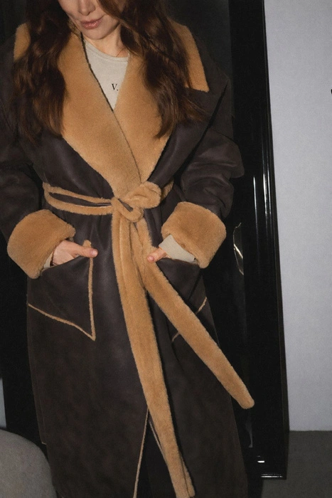 Oto nowa odsłona - długi kożuch w fasonie oversize, który łączy w sobie nonszalancję i elegancję! Wyposażony w dodatkowy wiązany pasek w tym samym materiale.  Wykonany z sztucznego futra w ciepłych karmelowych odcieniach, ten ponadczasowy model z pewnością przyciągnie spojrzenia. Gładkie wykończenie nadaje mu minimalistycznego uroku, a zapinanie na napy to funkcjonalny detal, który podkreśla jego nowoczesny charakter. Ten kożuch to nie tylko element garderoby – to manifest stylu dla kobiet, które nie boją się być w centrum uwagi. Idealny na chłodniejsze dni, sprawdzi się zarówno w casualowych, jak i bardziej eleganckich zestawieniach.